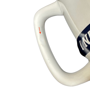 There is a manufacturing imperfection on the side and rear of the handle where some of the ceramic material is absent. This area is painted and glazed over. Please see the 360 photo and the read arrow pointing to this in the last photo.