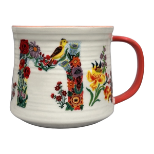 Features "MOM" written in a beautiful floral font with birds and insects wrapping around the majority of its exterior surface.