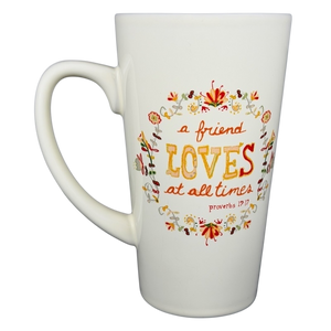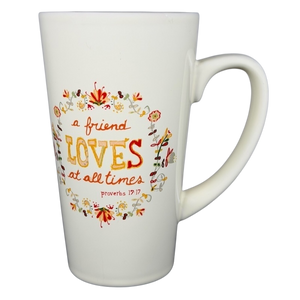 Celebrate the beauty of true friendship with this inspiring tall ceramic mug from Natural Life. The front features an encouraging message from Proverbs 17:17, reading “a friend loves at all times,” surrounded by a delicate wreath of hand-drawn floral illustrations in soft shades of red, gold, green, and orange. The artwork has a cozy, stitched and watercolor feel that adds charm and warmth to the design.
