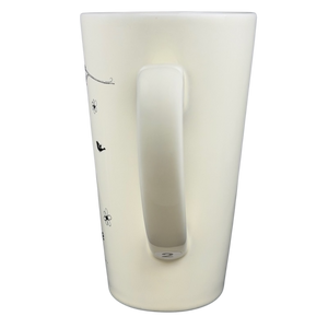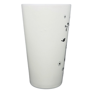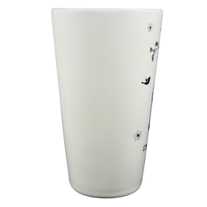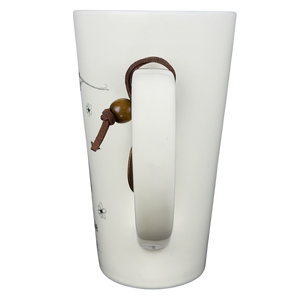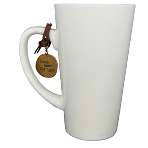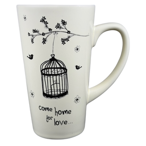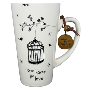 This Natural Life tall ceramic mug features a heartfelt black-and-white illustration with a gentle, uplifting message: “come home for love…” The artwork shows a delicate birdcage hanging from a branch adorned with blooming flowers, surrounded by small fluttering birds and doodled blossoms that add a sweet, hand-drawn charm. Its smooth, tapered shape feels comfortable in hand, and the clean white surface makes the design stand out beautifully. Hanging from the handle of copy one only is a rustic faux-leather cord with a round token that reads “come home for love,” giving the mug a warm, sentimental, gift-ready touch you won’t find on most pieces. Please note that copy two does not include this token.