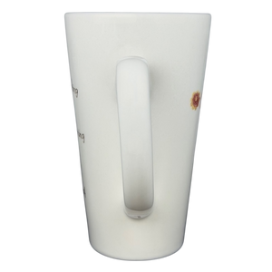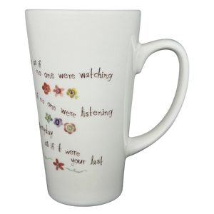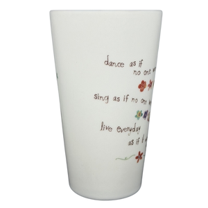 Bring a dose of inspiration to every sip with this uplifting tall mug from Natural Life, designed with a gentle reminder to embrace life wholeheartedly. The surface features a charming mix of handwritten-style lettering paired with tiny, colorful floral accents, forming a motivational message that reads: “Dance as if no one were watching, sing as if no one were listening, live everyday as if it were your last.” The words flow around the mug in a soft, free-spirited layout that feels warm, personal, and encouraging.