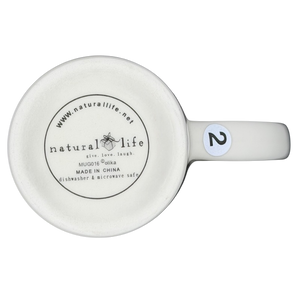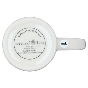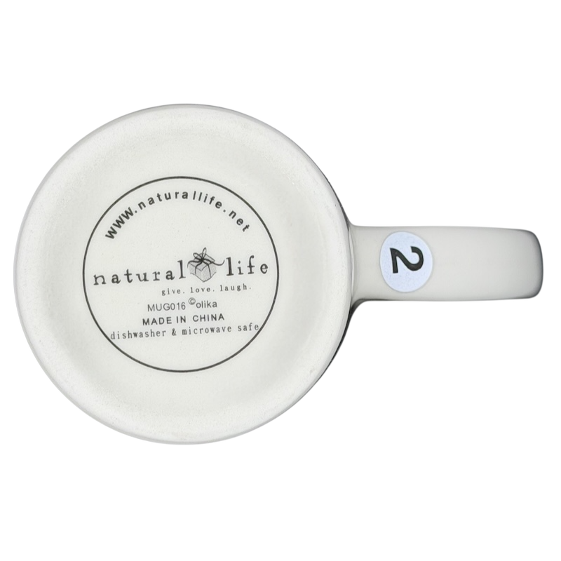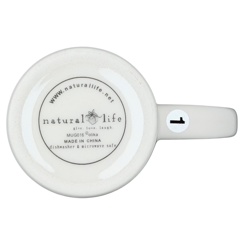 The tall, tapered shape offers a comfortable hold with a smoothly curved handle, while the cream-colored interior keeps the look clean and inviting. The base stamp confirms it as an authentic Natural Life piece, model MUG016, complete with Copyright © Olika, and notes that it is both dishwasher and microwave safe for everyday convenience.