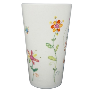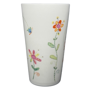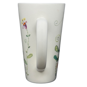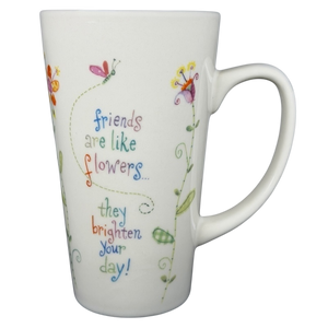 Brighten someone’s day with this charming tall mug from Natural Life, featuring cheerful artwork by Olika. The mug is decorated with lively, hand-drawn flowers in colorful mixed patterns, accompanied by fluttering butterflies and whimsical stitched-style details that wrap around the entire piece. On the front, the uplifting message “friends are like flowers… they brighten your day!” is written in a playful, multicolored script that perfectly complements the joyful floral design.