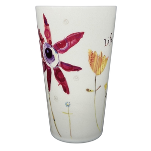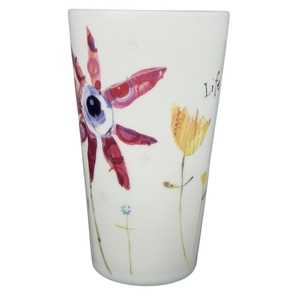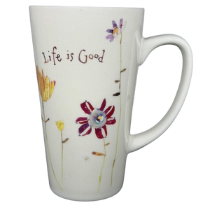 Celebrate the simple joys in life with this beautifully illustrated tall ceramic mug from Natural Life, featuring the vibrant and whimsical artwork of Robbin Rawlings. The front displays the uplifting phrase “Life is Good” in a warm, hand-lettered style, surrounded by colorful, sketch-inspired flowers that feel playful, artistic, and full of personality. The design wraps all the way around the mug with tall, slender stems, soft watercolor-like petals, and Rawlings’ signature mix of bold and delicate details.