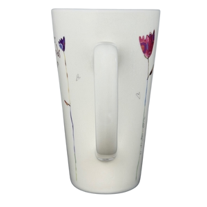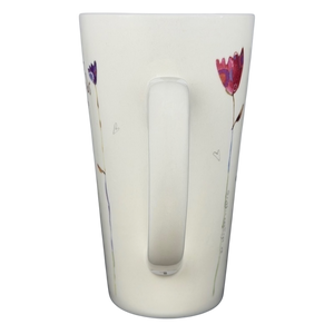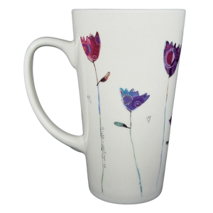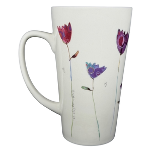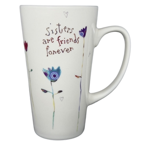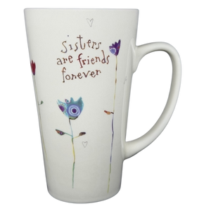 This charming Natural Life tall ceramic mug beautifully celebrates the unbreakable connection between sisters. The front features the heartfelt message “Sisters are friends forever,” written in Robbin Rawlings’ signature whimsical lettering. Surrounding the quote are her distinctive floral illustrations in vibrant shades of purple, red, and blue. The artwork continues around the mug with tall, slender flowers, tiny floating hearts, and a soft watercolor look that gives the piece a warm and uplifting feel.