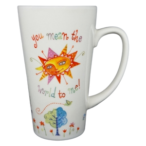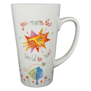 Bright, cheerful, and full of heart, this Natural Life tall ceramic mug shares a message that brings an instant smile: “You mean the world to me!” The front features a whimsical illustration of a radiant sun with expressive eyes surrounded by colorful patterns, paired with playful hand-lettered text. Below it, a charming nature scene with trees, flowers, butterflies, and a tiny bird adds warmth and personality, making this mug feel like a small piece of joyful artwork.