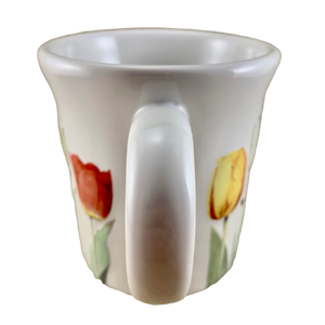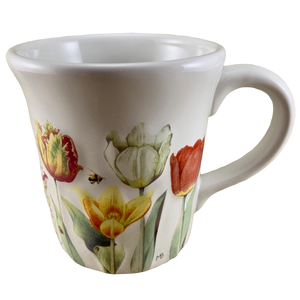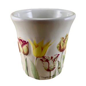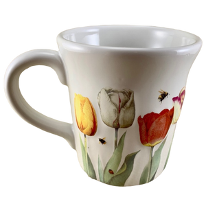 Feature embossed tulips and bees wrapping around its exterior surface.