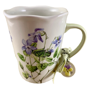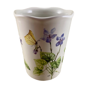 Feature artwork wrapping around its exterior surface consisting of violets and butterflies.