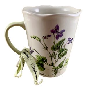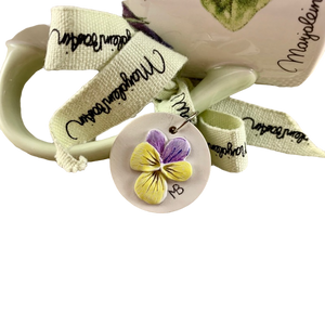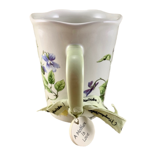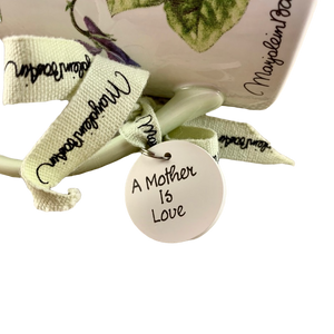 Also includes a ribbon tied loosely to the handle with an embossed yellow and purple flower on one side with "MB" below it and "A Mother Is Love" printed on the other side.