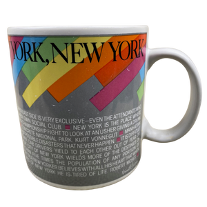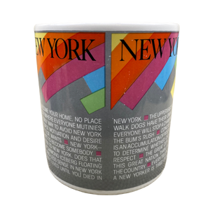 Features artwork wrapping around its exterior surface consisting of words and phrases having to do with New York.