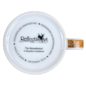 Features artwork wrapping around its exterior surface and on the handle depicting the painting "No Boundaries" by Hayden Lambson.
