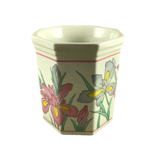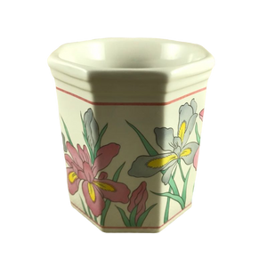 Features floral artwork wrapping around its exterior surface and a double raised lip.