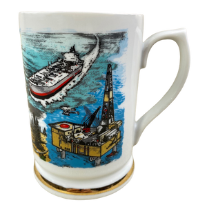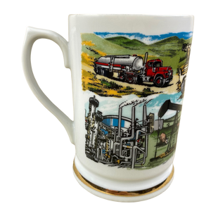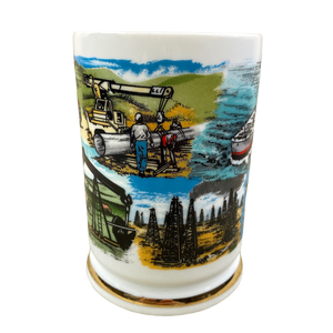 This vintage mug features bold artwork depicting the phases involved in the oil extraction process. This includes oil derricks, an offshore drilling platform, truck and ship transports, oil pipeline, and a refinery.