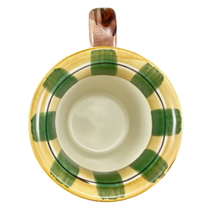 Wrapping around the inner upper surface is a striped pattern in shades of brown and green.