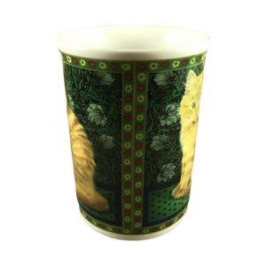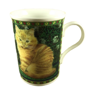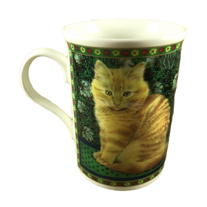 Features identical artwork on the front and back of the mug consisting of an adorable orange cat in front of a green background with flowers.