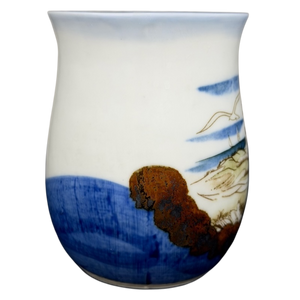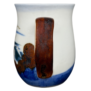 This vintage Otagiri stoneware mug features a tranquil coastal scene with soaring seagulls, a striped lighthouse, and sailboats along a windswept shoreline. The gently flared form is finished in a creamy off-white glaze, grounded by a deep blue ocean band and accented with richly textured earthy brown detailing along the rocky coast. A comfortably curved handle with warm brown glaze adds rustic contrast, while subtle glaze variations enhance its handcrafted character. A beautifully detailed, seaside-inspired mug that brings the calm and charm of the coast to everyday coffee or tea moments.