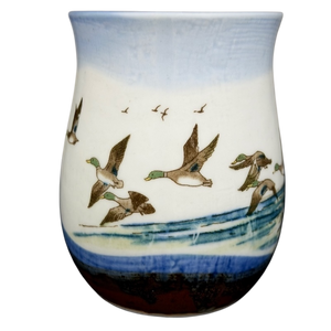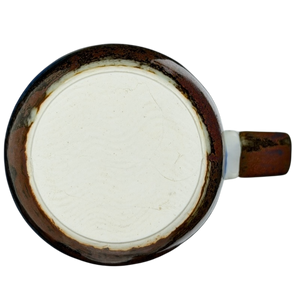 This vintage Otagiri stoneware mug showcases a tranquil wraparound scene of mallard ducks in flight skimming across rippling blue water, with shoreline grasses and distant birds adding depth and movement. The softly flared shape features a creamy off-white body that fades into a pale blue sky glaze, grounded by a richly textured earthy brown base. A comfortably curved handle finished in warm brown glaze complements the rustic aesthetic, while natural glaze variations enhance its handcrafted character, making it a charming nature-inspired piece for everyday coffee or tea.