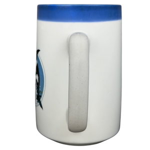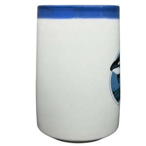 This vintage ceramic mug features a striking orca whale illustration leaping through stylized ocean waves, framed within a circular medallion and accented by a deep blue band along the rim for a clean nautical look. The crisp white body highlights the detailed marine artwork, while the comfortable handle and gently tapered shape make it practical for everyday use. Made by Otagiri, this piece reflects the brand’s well-known quality and artistic charm, making it a collectible choice for whale lovers, coastal décor enthusiasts, or fans of classic Otagiri designs.