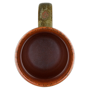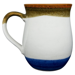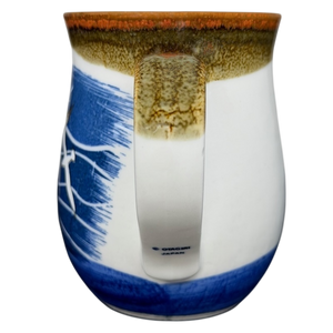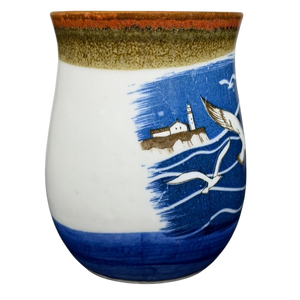 This stoneware mug by Otagiri features a striking coastal scene with white seabirds gliding over deep blue, wave-brushed waters, accented by a distant lighthouse along the shoreline. The artwork is framed by a warm, earthy glaze at the rim with a subtle rust-orange edge, while a rich blue band grounds the base, creating a balanced, handcrafted aesthetic. Its gently rounded body, comfortable handle, and softly flared lip make it ideal for everyday use, while the bold maritime design and Otagiri craftsmanship give it strong appeal for collectors who appreciate scenic, nature-inspired ceramics.