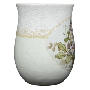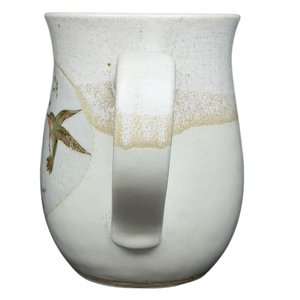 This vintage Otagiri stoneware mug features a serene floral design paired with a graceful hummingbird in flight, illustrated in soft pastel tones that evoke a peaceful, nature-inspired aesthetic. The gently flared rim, rounded body, and sturdy handle provide a comfortable, well-balanced feel, while the speckled off-white glaze and subtle earth-toned band add warmth and understated rustic character. The artwork is framed within an organic oval vignette typical of Otagiri’s decorative style, making it a charming addition to a collectible mug display or an inviting choice for everyday use.
