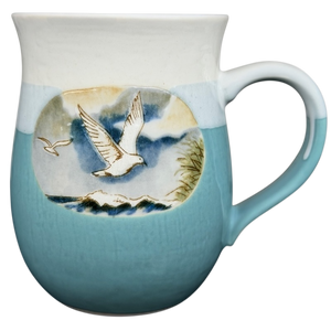 This vintage Otagiri stoneware mug features a serene coastal vignette framed in an oval medallion, depicting graceful seagulls gliding above rolling waves beneath softly brushed clouds. The gently rounded form is finished in calming aqua blue with a pale sky-blue transition and a creamy off-white rim, creating a soothing, beach-inspired palette. A comfortably curved handle echoes the layered glazes, while subtle surface variations add to its artisanal character. A peaceful, seaside-themed mug that brings a sense of calm and coastal charm to everyday coffee or tea.