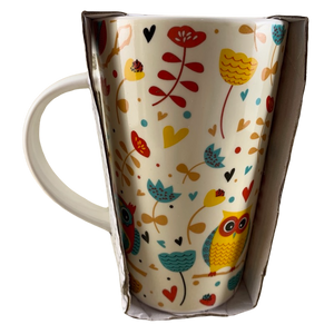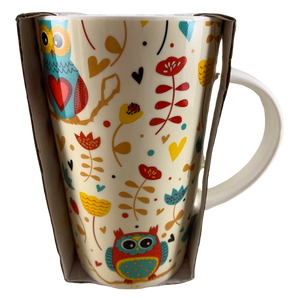 Features a whimsical pattern of owls, flowers, and hearts wrapping around its exterior surface.