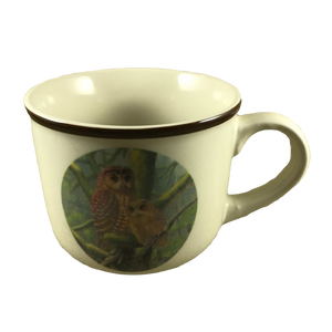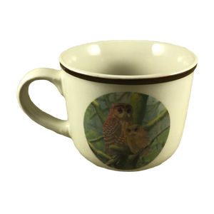 Features an image of two owls sitting in a tree both on the front and rear of this mug.
