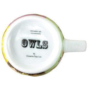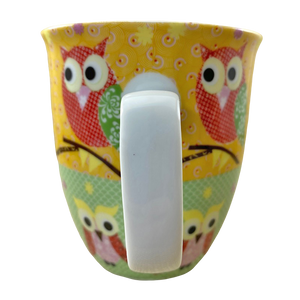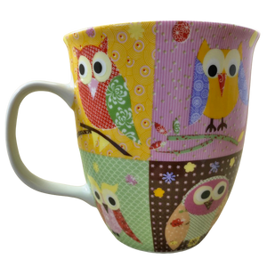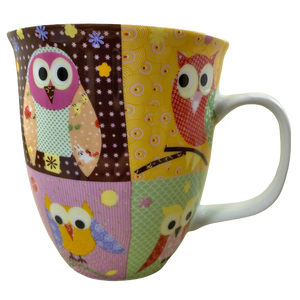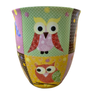 Features whimsical artwork wrapping around the exterior surface consisting of a patchwork of different owls.