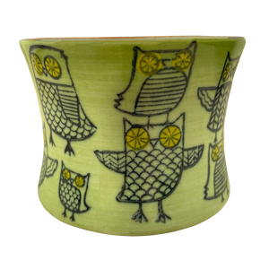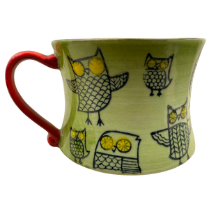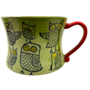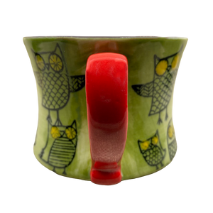 This stackable mug features whimsical artwork depicting owls wrapping around its exterior surface.