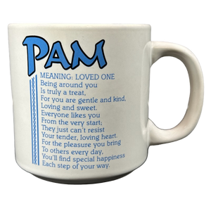 Features the name PAM printed in a large font on then front upper surface. Directly underneath this is a poem about the name PAM.