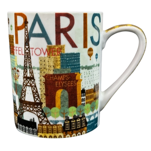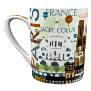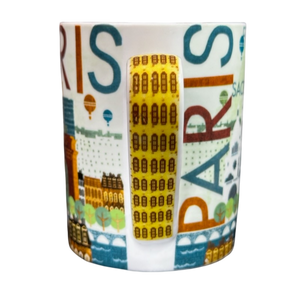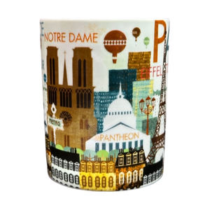 Features artwork wrapping around the exterior surface and on the handle related to Paris, France.