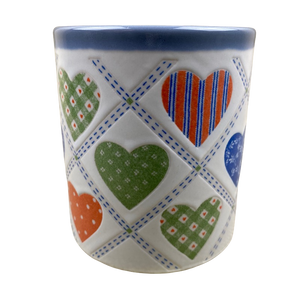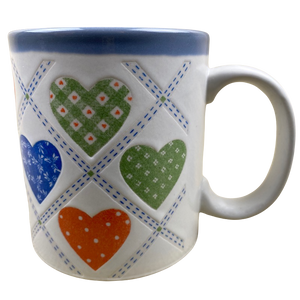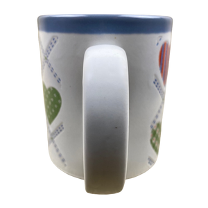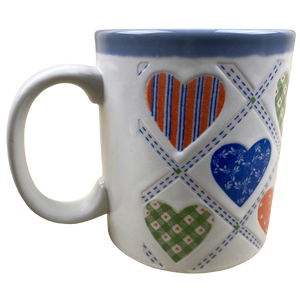 This beautiful mug features a pattern of patchwork quilted hearts wrapping around its exterior surface.