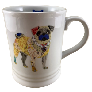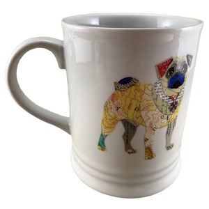Features a dog on its front and rear surface that is made up of a patchwork of different looking textures.