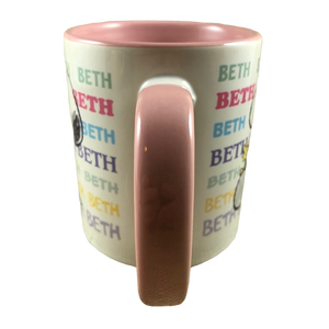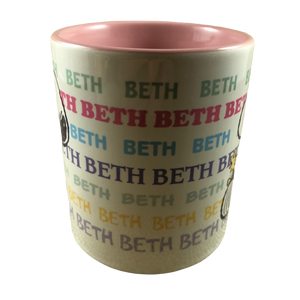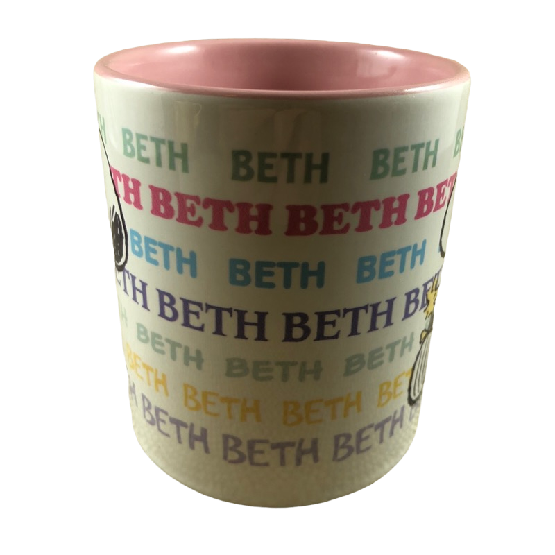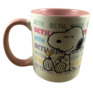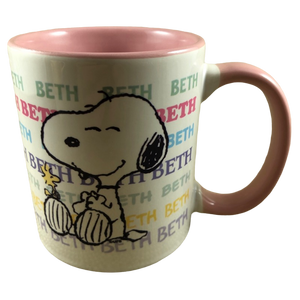 Printed all around this mug and surrounding Snoopy and Woodsctock in multiple colors is "BETH."