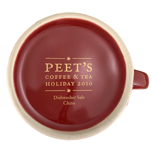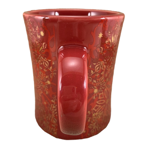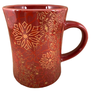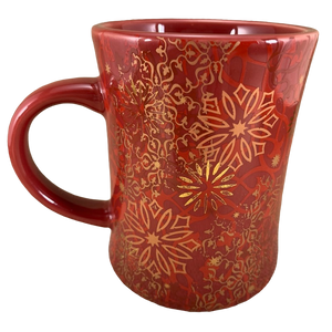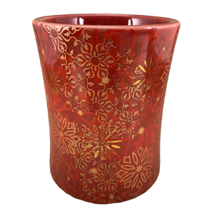 Features festive gold and red snowflakes wrapping around its exterior surface.
