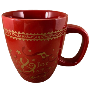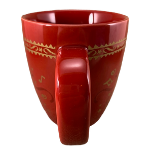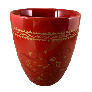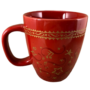 Features festive gold and red stars and music notes wrapping around its exterior surface.