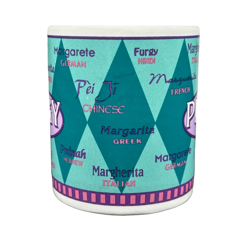 Wrapping around the exterior surface are translations of the name PEGGY in many languages.