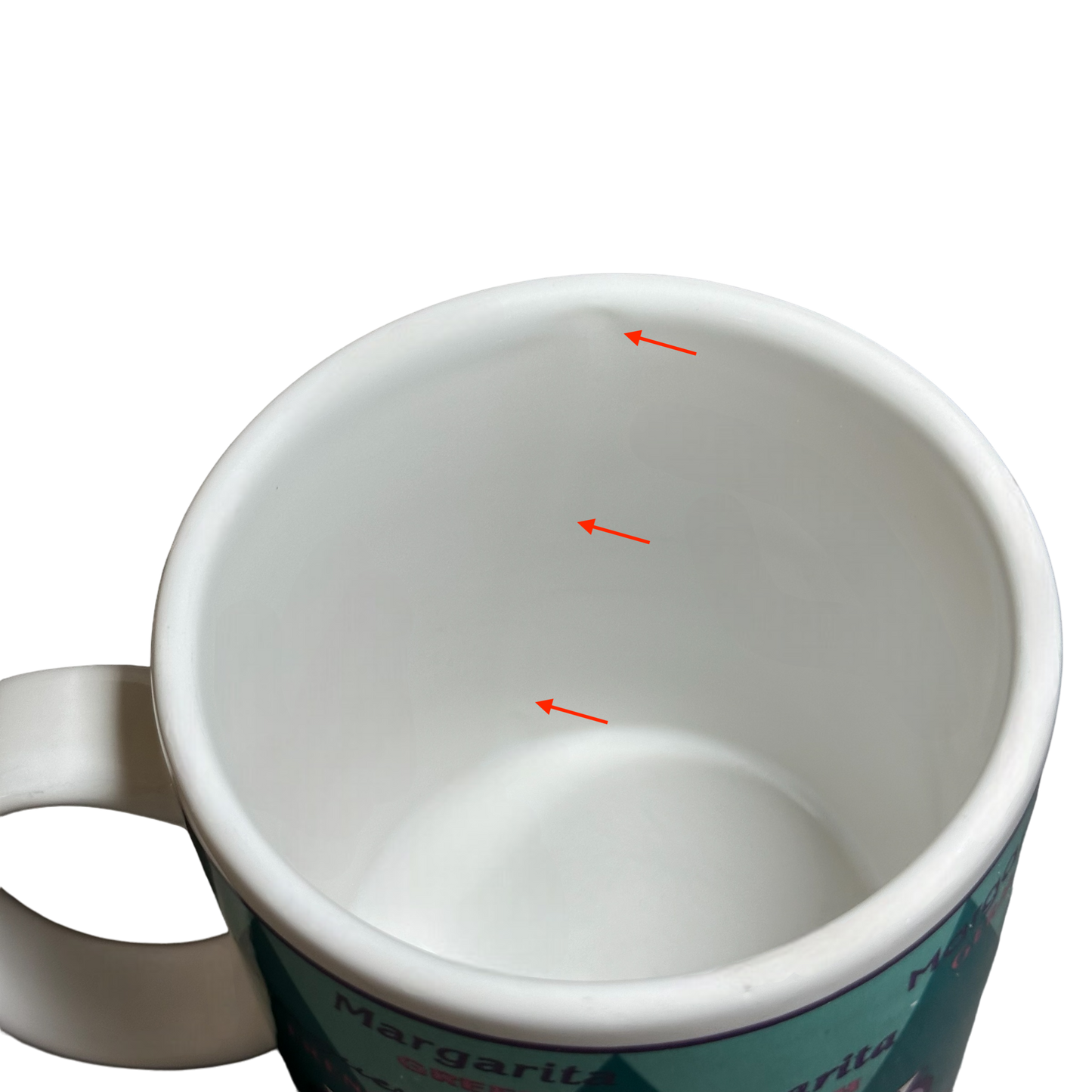 There is an indented spot on the interior rim with a very faint white area extending down below it. Please see the red arrows pointing to this in the last photo.
