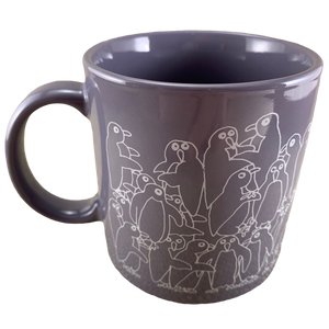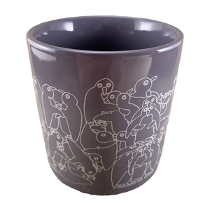 Features artwork wrapping around the exterior surface consisting of penguins being naughty.