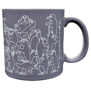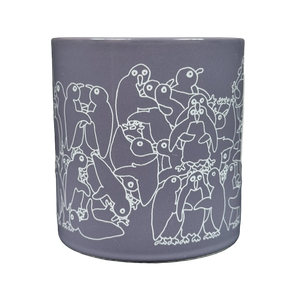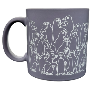 Features artwork wrapping around the exterior surface consisting of penguins being naughty.