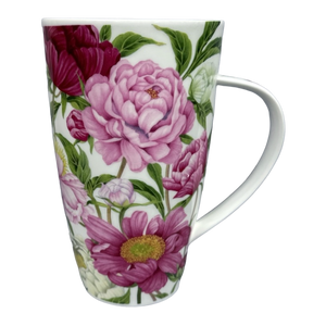 This taller mug features gorgeous artwork depicting peony flowers wrapping around its exterior surface and on the handle.