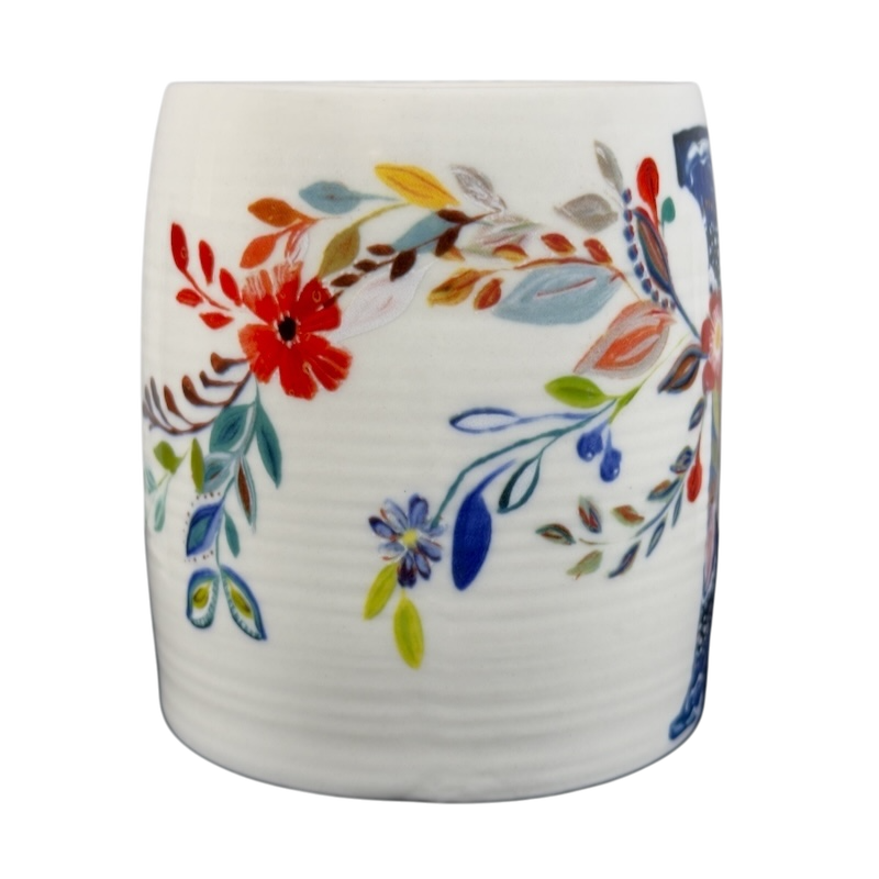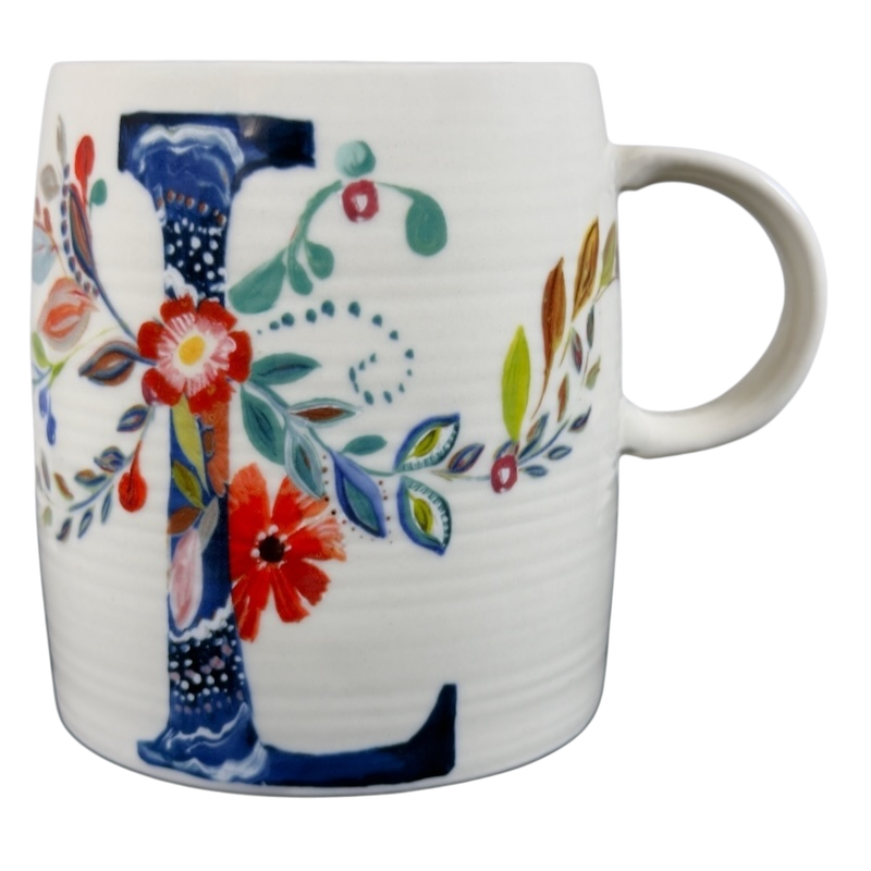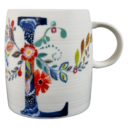 Features a floral pattern wrapping around the exterior surface with the letter "L" printed on the front surface.