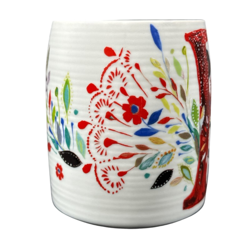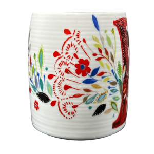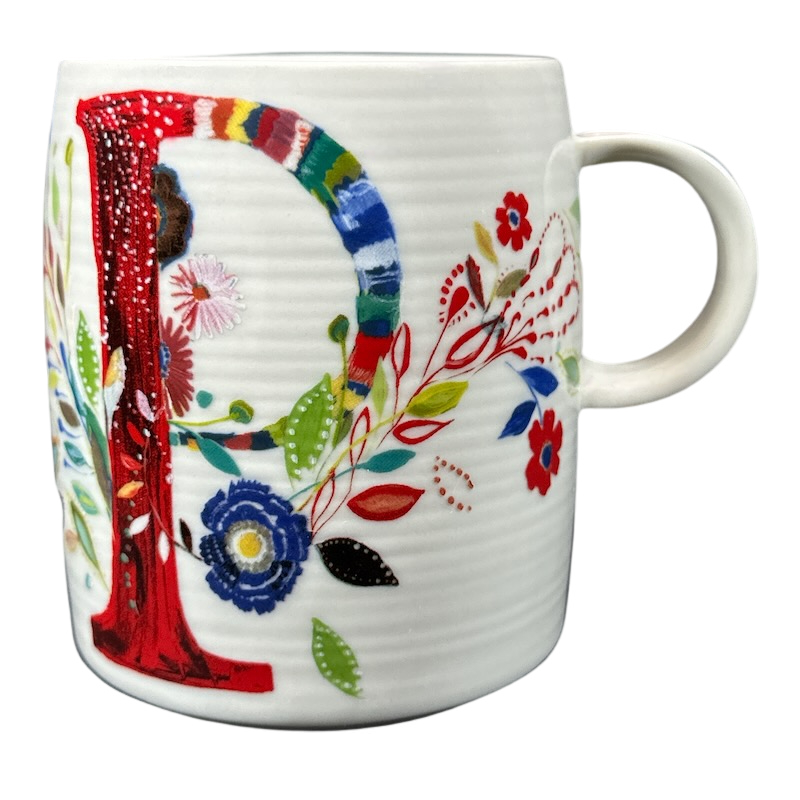 Features a floral pattern wrapping around the exterior surface with the letter "P" printed on the front surface.