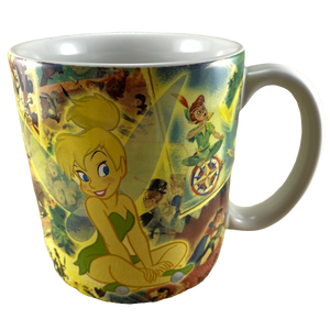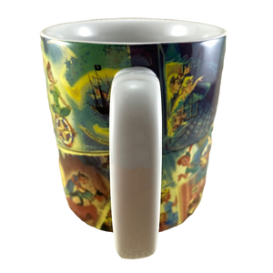 This mug features artwork wrapping around its exterior surface depicting characters and scenes from Peter Pan.