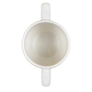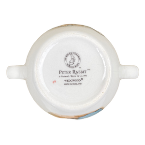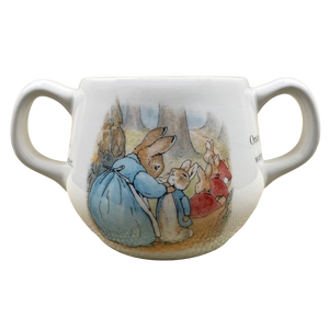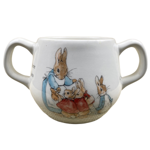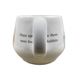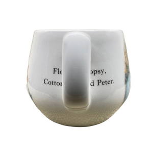 This double handle mug features artwork on its front and rear surface depicting Peter Rabbit, Flopsy, Mopsy, and Cotton-tail