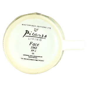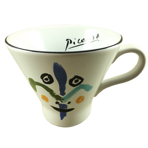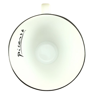 Features artwork on the front surface and "Picasso" written in a cursive like font inside the mug on the rear upper surface.