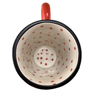 Also features a red fancy scroll handle and red polka dots on its interior.