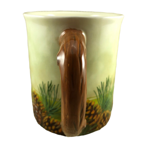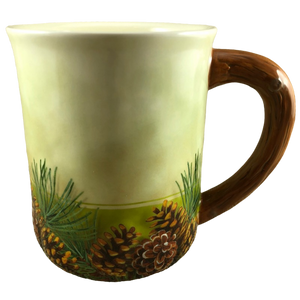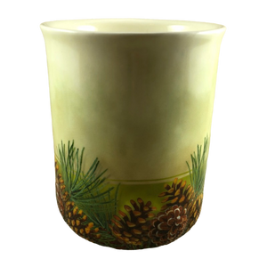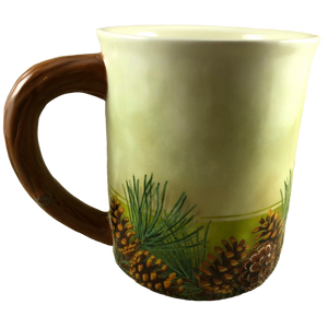 It features embossed pinecones and pine needles wrapping around its lower half.