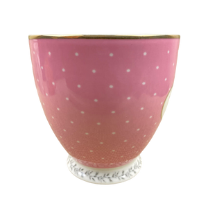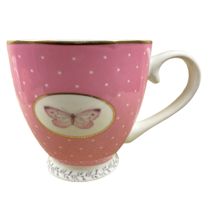 Feature a single pink butterfly centered on its front and rear surface surrounded in a gold oval against a white background. Surrounding this the remainder of the surface is pink with white dots..