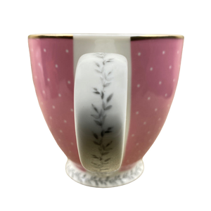 Wrapping around the footed base on the exterior is a ring of trim comprised of leaves. The same trim runs down the center of the handle.